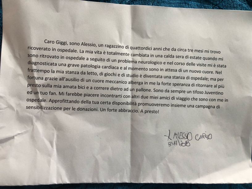 All’Ospedale Monaldi i medici sono fantastici e davvero sono vicini alle persone che sono ricoverate. Nelle grandi difficoltà nasce fratellanza ed amicizia. Alessio non è solo e vive con la sua seconda famiglia insieme ai suoi compagni di stanza e al personale che lo segue con grande abnegazione e passione. La cardiochirurgia poi è un reparto dove i sogni e le speranze di guarigione si devono confrontare ogni giorno con la possibilità di ricevere gli organi. Per questo bisognerebbe sempre promuovere una campagna di sensibilizzazione alla donazione. DONARE è VITA! E proprio per questo Alessio nella sua lettera non chiede solo di incontrare il suo campione preferito ma desidera che Buffon sia testimonial di una campagna di sensibilizzazione per la Donazione degli Organi! Bravo Alessio e spero che il tuo sogno possa realizzarsi!