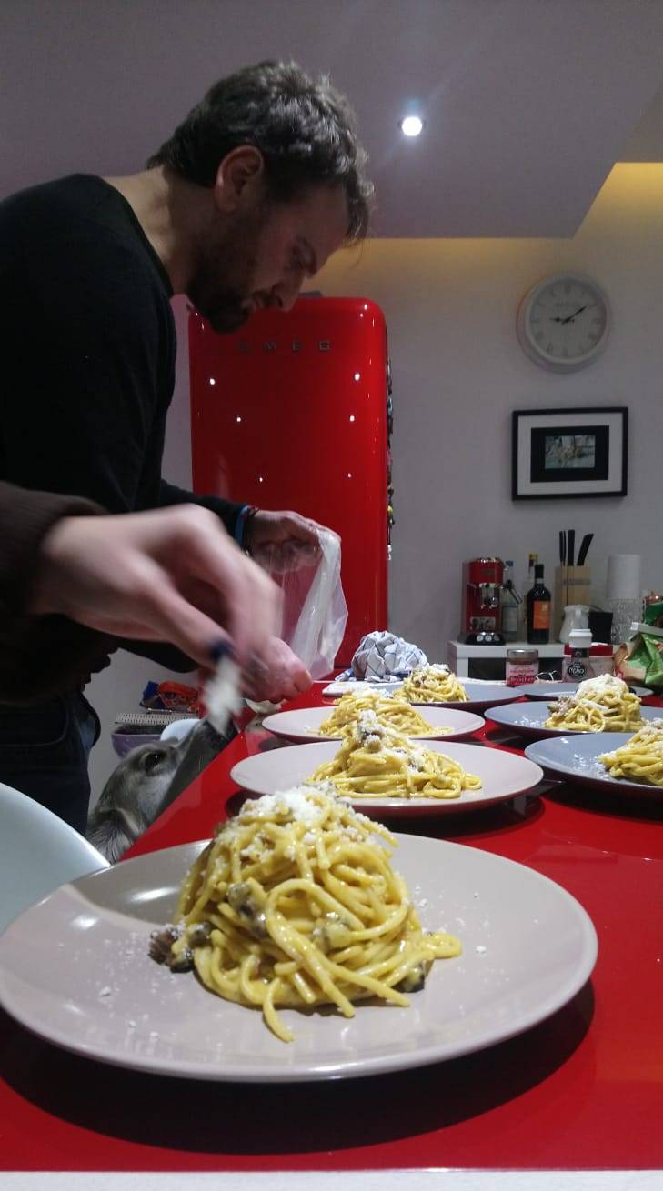 Detto questo la cosa più importante nella realizzazione di un’ottima carbonara è quella di aggiungere il pastello a fuoco spento alla pasta che deve finire la cottura insieme al grasso rilasciato dal guanciale appassito in padella che abbiamo preservato in maniera quasi religiosa. Se occorre si può tranquillamente aiutarsi con l’acqua di cottura della pasta per creare la giusta cremosità. Una volta fatti questi semplici passaggi servite e buon appetito. Ma mi raccomando però quando preparate questa benedetta carbonara ricordatevi che dovete usare SOLO il guanciale!