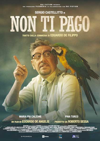 Lo voglio chiarire subito. A me Non ti Pago di Edoardo De Angelis è piaciuto. Non è uguale alla versione di De Filippo che abbiamo divorato per anni. E quindi? Non lo trovo un difetto. Anzi. Sergio Castellitto nei panni di Ferdinando è credibile e catalizzante. Tutto il racconto ruota intorno alla sua lucida follia. Quello che per gli altri è pazzia per lui è legge. Dopo Natale in casa Cupiello e Sabato, Domenica e Lunedì, trasmessi rispettivamente nel 2020 e nel 2021 si chiude la trilogia omaggio di De Angelis a de Filippo con Non ti pago sempre con Sergio Castellitto che si eduardizza. Critica, pubblico ed esponenti del mondo dello spettacolo hanno pareri molto discordanti. Molti hanno puntato il dito contro alcune scelte del regista che non appartengono all’opera originale come il pappagallo parlante, la ciuccia alata o i balletti del protagonista. Il cast è di grande livello. Oltre a Sergio Castellitto il film è interpretato anche da Maria Pia Calzone, nei panni di Concetta, la moglie del protagonista, Pina Turco, Giovanni Ludeno, Gianluca Di Gennaro, Angela Fontana (una delle gemelle protagoniste di Indivisibili) nei panni di Margherita e Giovanni Esposito, che interpreta con la giusta dose di ironia l’avvocato Lorenzo Strumillo. Bello vedere sulla stessa scena anche la dinastia dei Casagrande. Infatti oltre a Maurizio nel ruolo del prete c’è anche Antonio Casagrande, venuto a mancare l’anno scorso, nei panni di Don Saverio.